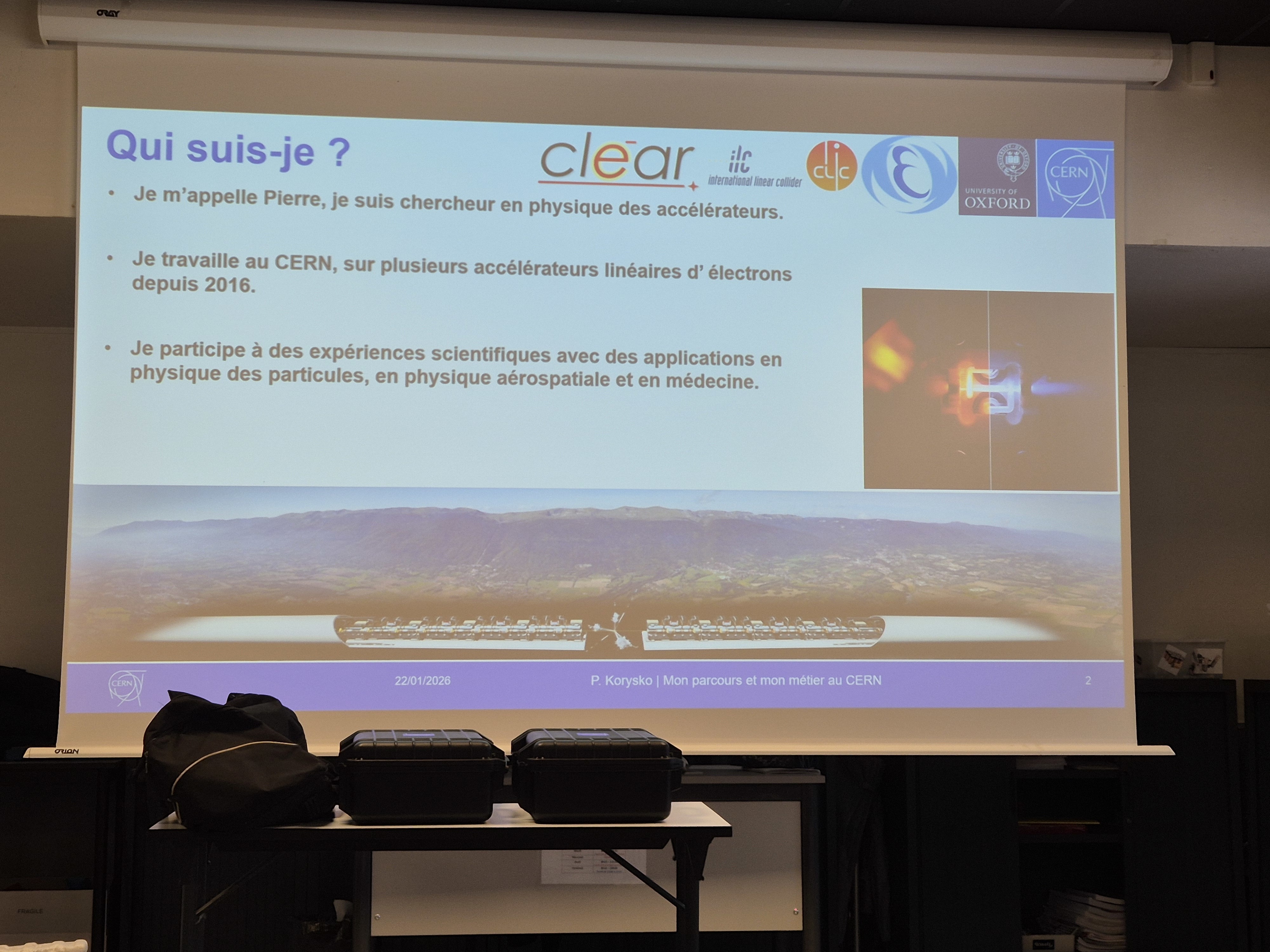 Pierre Korysko a présenté son parcours, son quotidien de physicien ainsi que les missions du CERN, en expliquant de manière accessible les enjeux de la recherche en physique. Les élèves ont pu poser de nombreuses questions et mieux comprendre les débouchés offerts par les sciences.